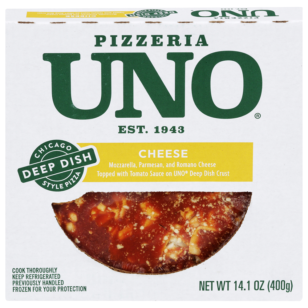 Uno 7″ Chicago Style Deep Dish Cheese Pizza with handmade signature deep dish crust, filled with shredded mozzarella cheese and topped with tomato sauce. Pizza is lightly seasoned with grated Romano and grated Parmesan cheeses, garlic powder and oregano.