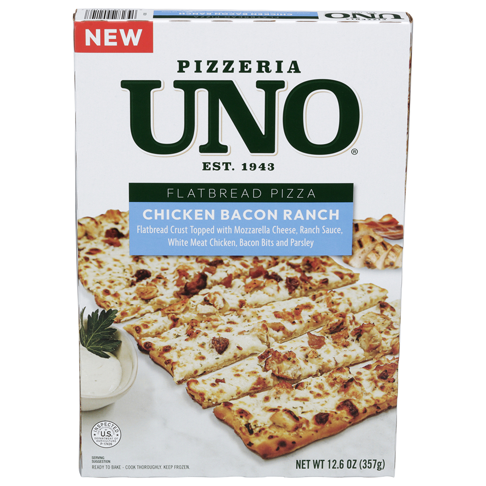 Now in the freezer aisle! Mozzarella cheese, diced white meat chicken, bacon bits and parsley with ranch sauce on a flatbread crust