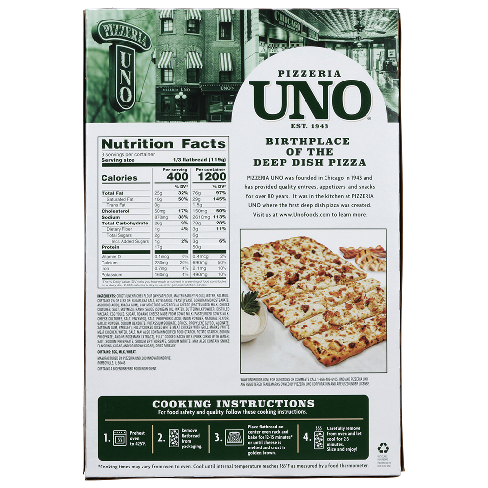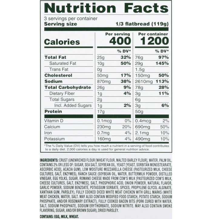 Ingredients: Crust (unenriched flour [wheat flour, malted barley flour], water, palm oil, contains 2% or less of: sugar, sea salt, soybean oil, yeast [yeast, sorbitan monostearate, ascorbic acid], acacia gum), low moisture mozzarella cheese (pasteurized milk, cheese cultures, salt, enzymes), ranch sauce (soybean oil, water, buttermilk, distilled vinegar, egg yolks, salt, Romano cheese [pasteurized cow’s milk, cheese cultures, salt, enzymes], contains 2% or less of: sugar, phosphoric acid, dehydrated garlic, dehydrated onion, corn maltodextrin, xanthan gum, potassium sorbate, sodium benzoate, spices, dehydrated parsley, yeast extract, propylene glycol alginate, natural flavors), fully cooked diced white meat chicken with grill marks (white meat chicken, water, food starch-modified, salt, sodium phosphate), fully cooked bacon bits (pork cured with water, salt, smoke flavoring, sodium phosphate, sodium erythorbate, sodium nitrite. May contain sugar, brown sugar), dried parsley.