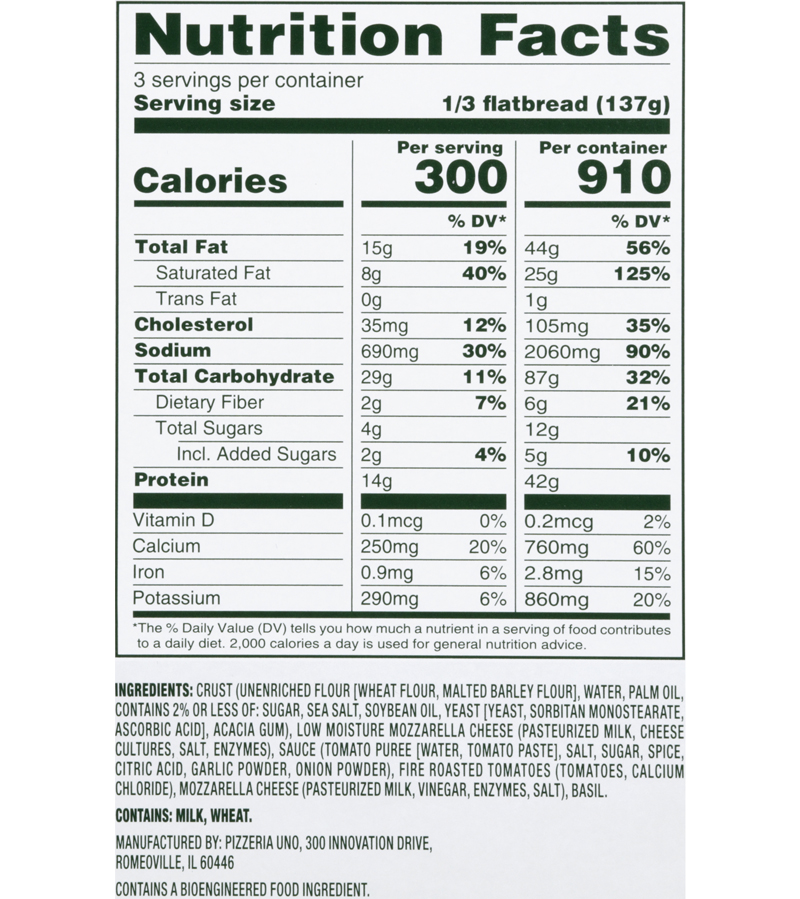 Ingredients: Crust (unenriched flour [wheat flour, malted barley flour], water, palm oil, contains 2% or less of: sugar, sea salt, soybean oil, yeast [yeast, sorbitan monostearate, ascorbic acid], acacia gum), low moisture mozzarella cheese (pasteurized milk, cheese cultures, salt, enzymes), sauce (tomato puree [water, tomato paste], salt, sugar, spice, citric acid, garlic powder, onion powder), fire roasted tomatoes (tomatoes, calcium chloride), mozzarella cheese (pasteurized milk, vinegar, enzymes, salt), basil.